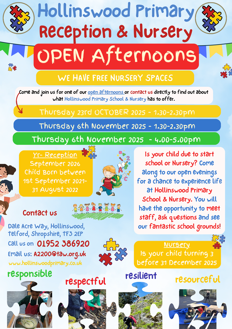Please come along to one of our three open afternoons to experience life at Hollinswood Primary School & Nursery. You will have the opportunity to meet staff, ask questions and see our fantastic school grounds and facilities on offer.